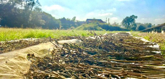 本日、胡麻の「干し」までの作業が完了しました。 収穫した胡麻はまとめて置いていた...