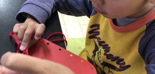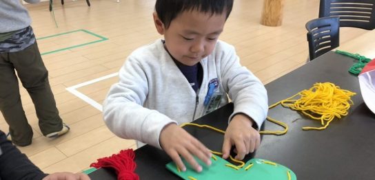 こんにちは! 今日は壁面制作をしました!もうすぐクリスマスが来ます。 靴下にひも...