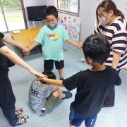 【ビニール傘玉入れ】では、投げる動作と狙う力(調整力)といった感覚統合の力を伸ばします。最近は広場でキャッチボールをするといった、物を投げる体験をする子どもが少ないので、うまく投げられなかったり、力加減を調節して狙うのが苦手な子も多いです😥なので活動を通して、そういった体験を補っていきます✨