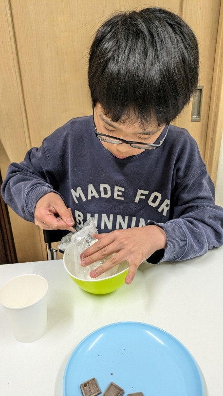 ②①と水を混ぜて、チョコレートを入れます!