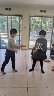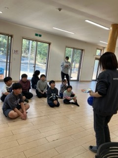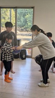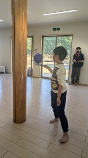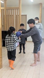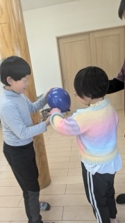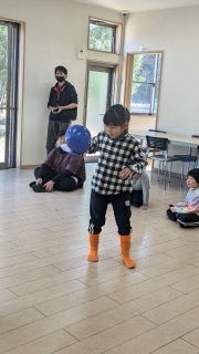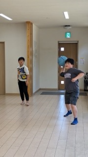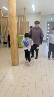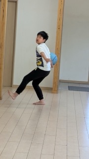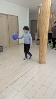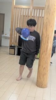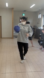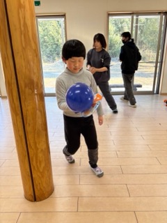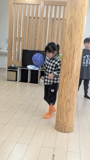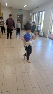 ①うちわの上に風船を乗せ、柱を八の字で進みます。