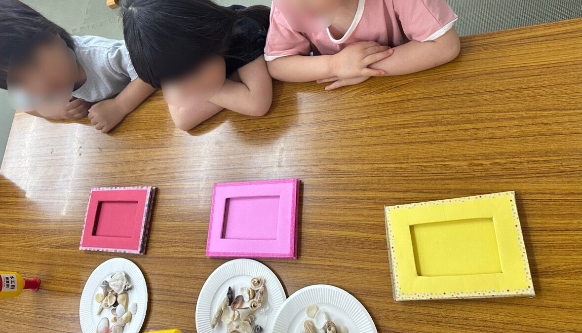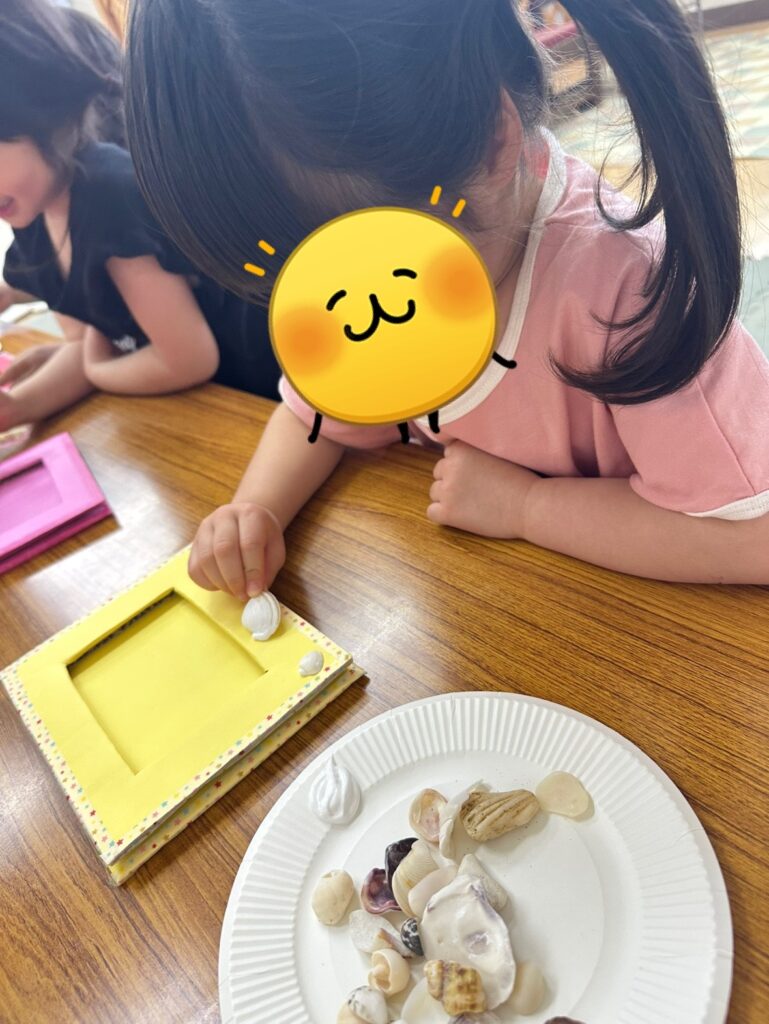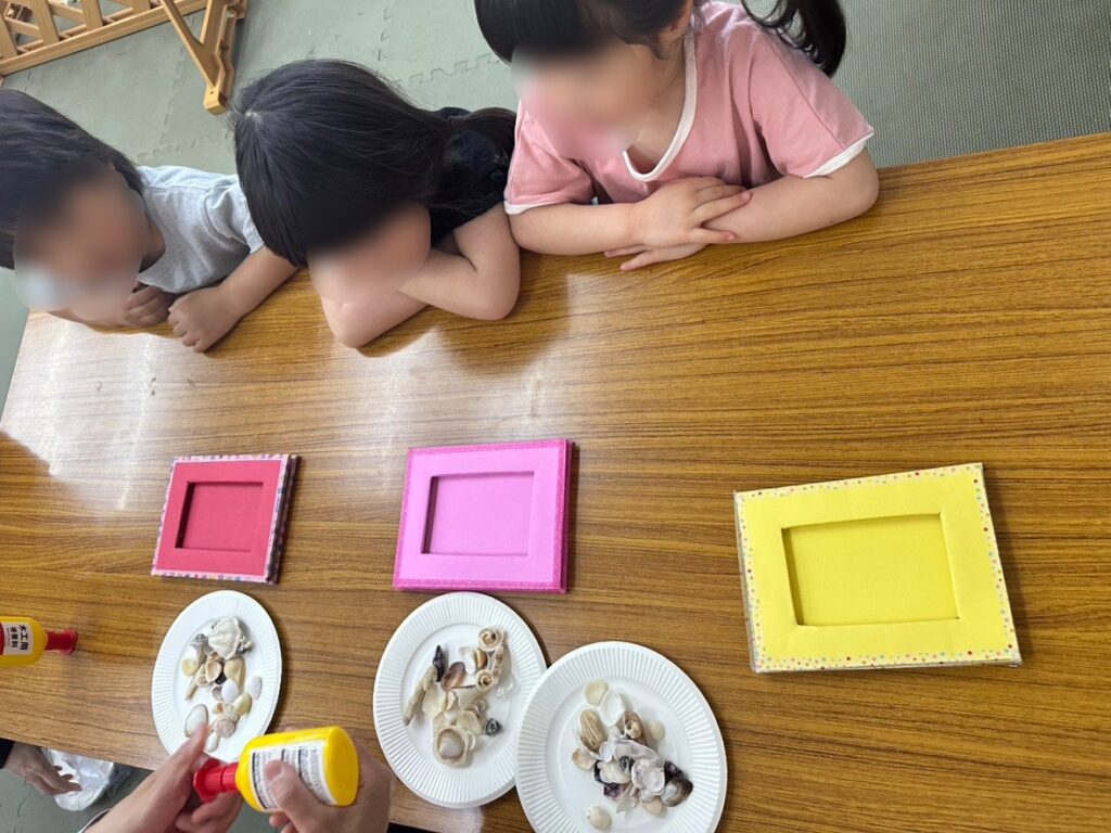 職員が作ったフレームに、子どもたちが拾ってきた貝殻やビーズ、ポンポンなどを使って、思い思いに飾りつけ✨