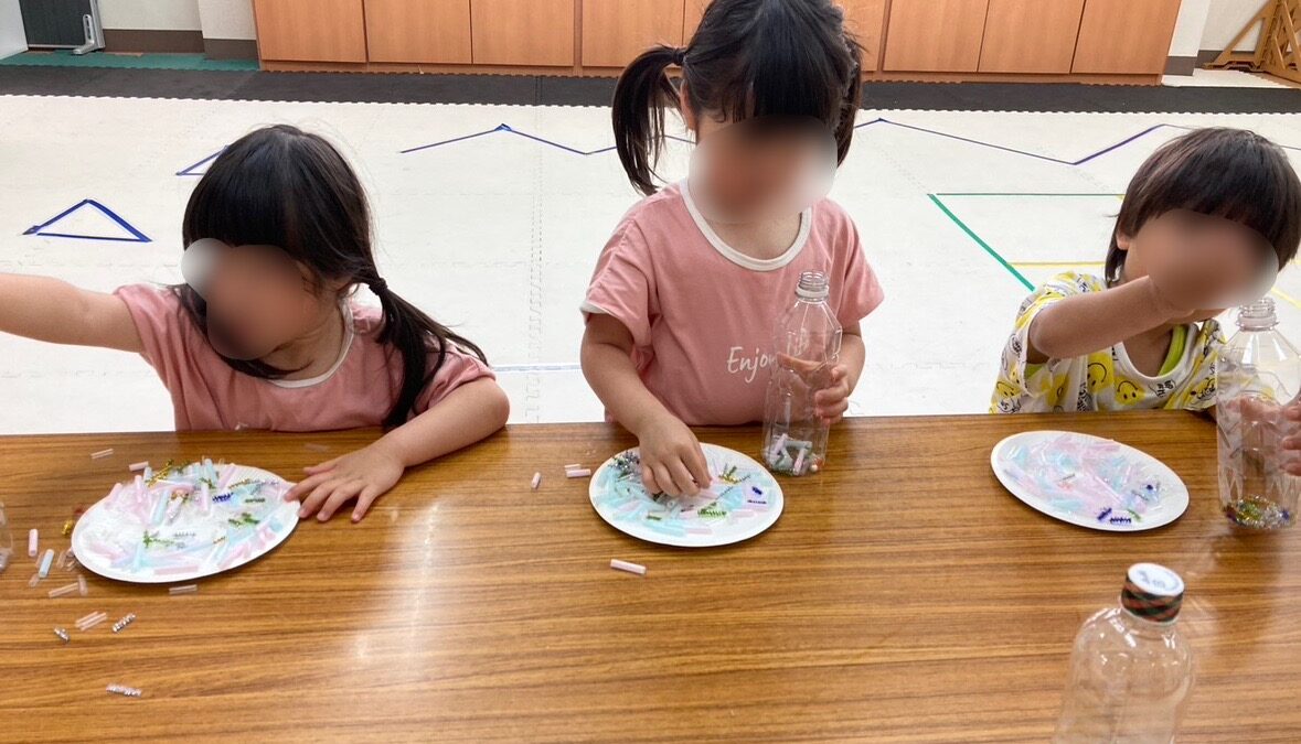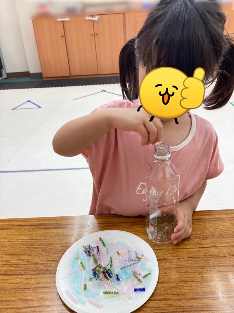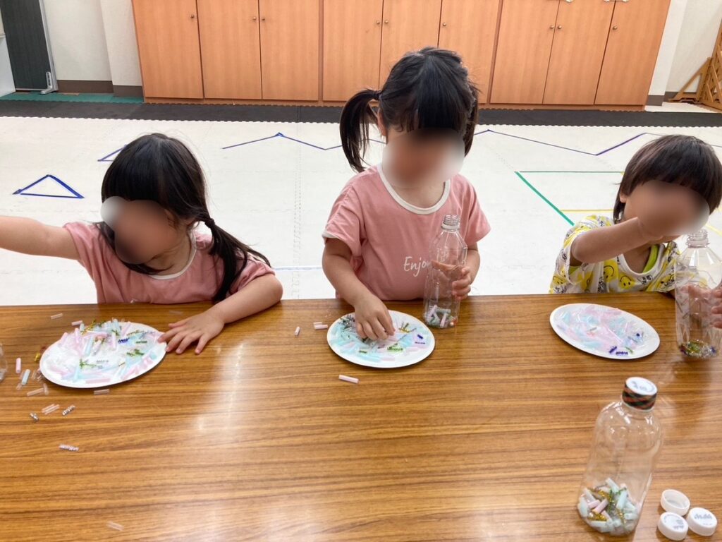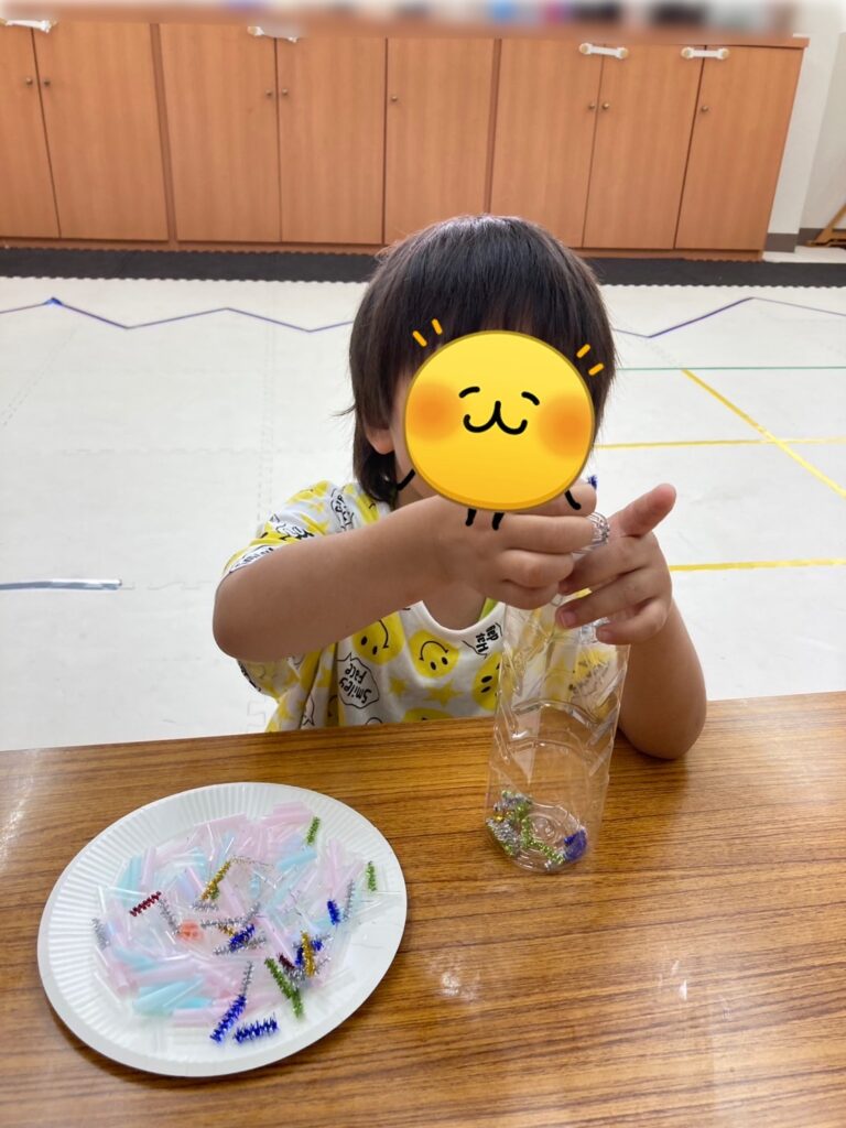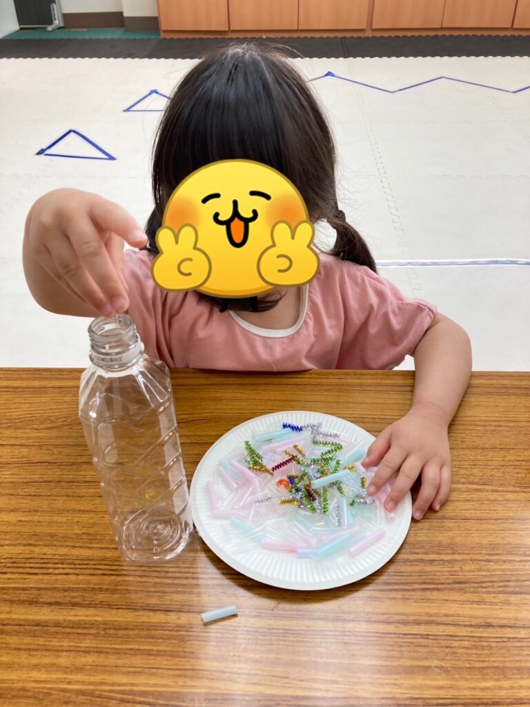 まずは空のペットボトルに、カラフルなビーズやモール、小さく切ったストローを自分で選んで入れていきます。