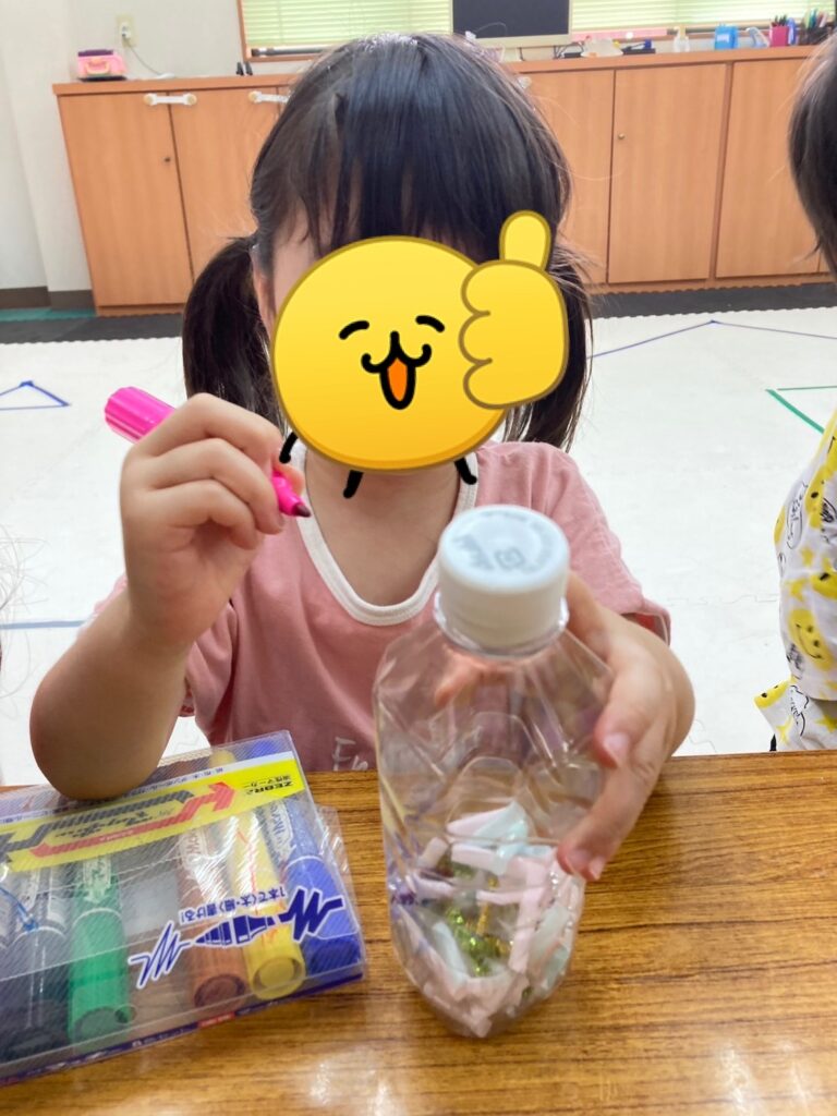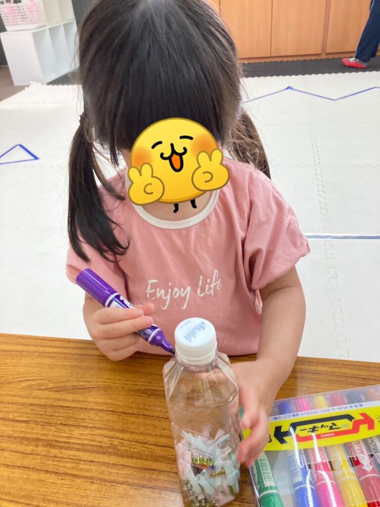 中身を入れ終わったら、次はペットボトルの外側にマジックで自由にお絵描きタイム!