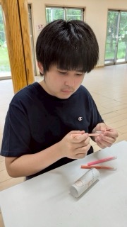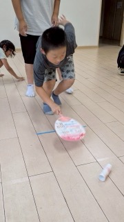 トイレットペーパーの芯をうちわであおぎながらゴールを目指します!手で触れずに、うちわの風だけで進めるのがポイントです💨