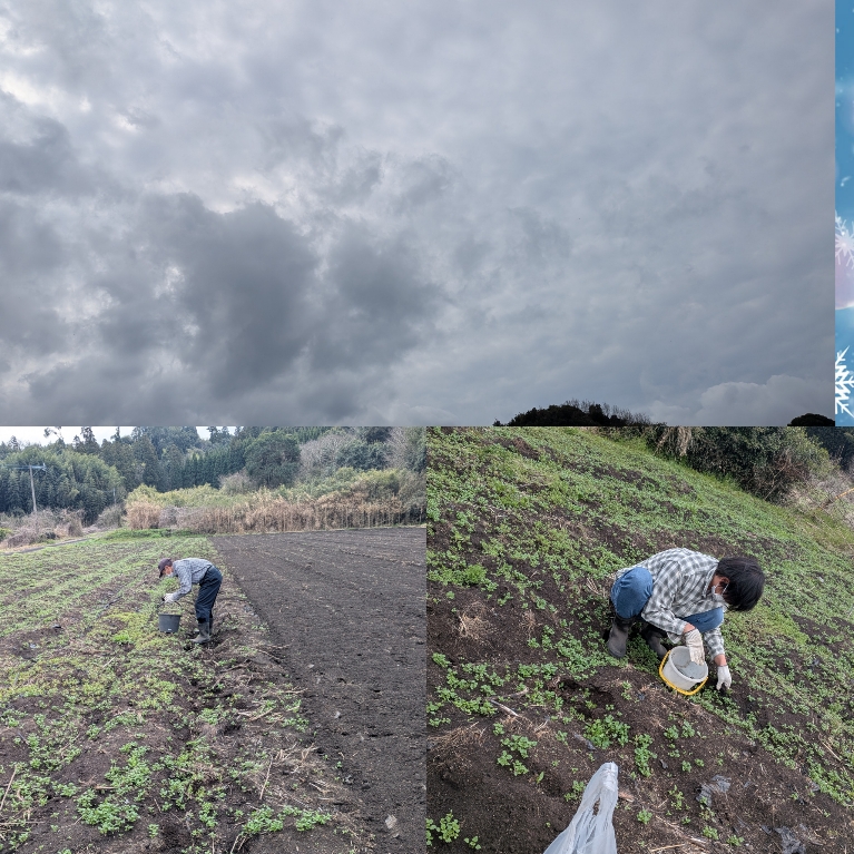みまた就労継続支援えがおの里三股就労継続支援B型 委託作業 2026年3月24日 曇り空の中・・・提携している農家さんにて、マルチ剝がしをしましたK職員さん入れて4人で力を合わせてマルチ取り除きをしましたq(≧▽≦q)